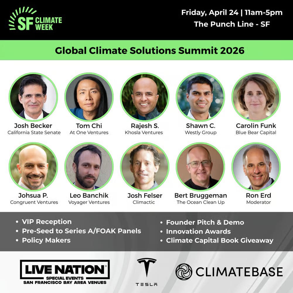 📝 Description: A flagship SF Climate Week summit featuring top-tier VCs, founder pitches, and a keynote from State Senator Josh Becker on driving actionable climate solutions.