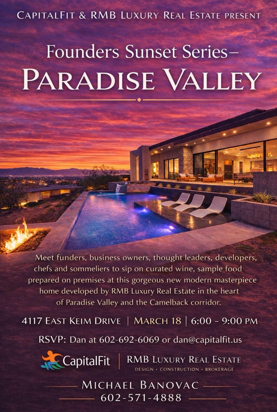 π Description: An evening mixer for entrepreneurs and investors at a luxury estate featuring sunset views of Camelback Mountain.